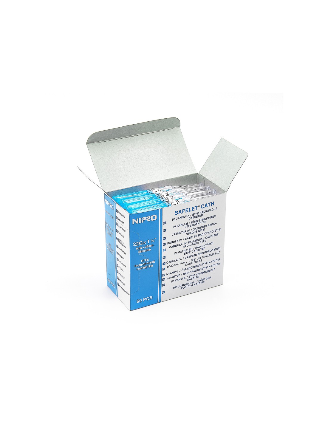Catéter periférico IV 22G fabricado en e.t.f.e. Resistente y termosensible. Diseño ergonómico que permite técnica de punción con una sola mano. Disponible en cajas de 50 unidades.