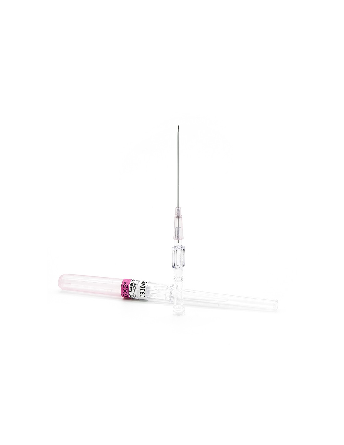 Peripheral IV catheter of 20G, made of etfe plastic, resistant and thermosensitive. Ergonomic design that allows for a single handed puncturing. Available in boxes containing 50 units each.