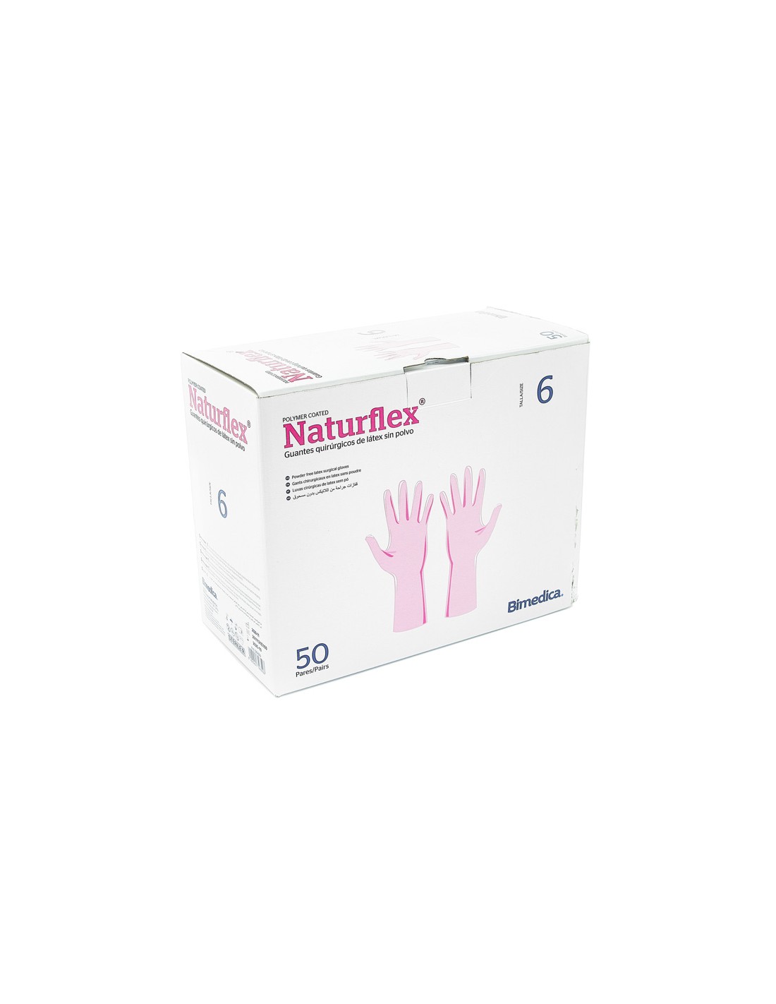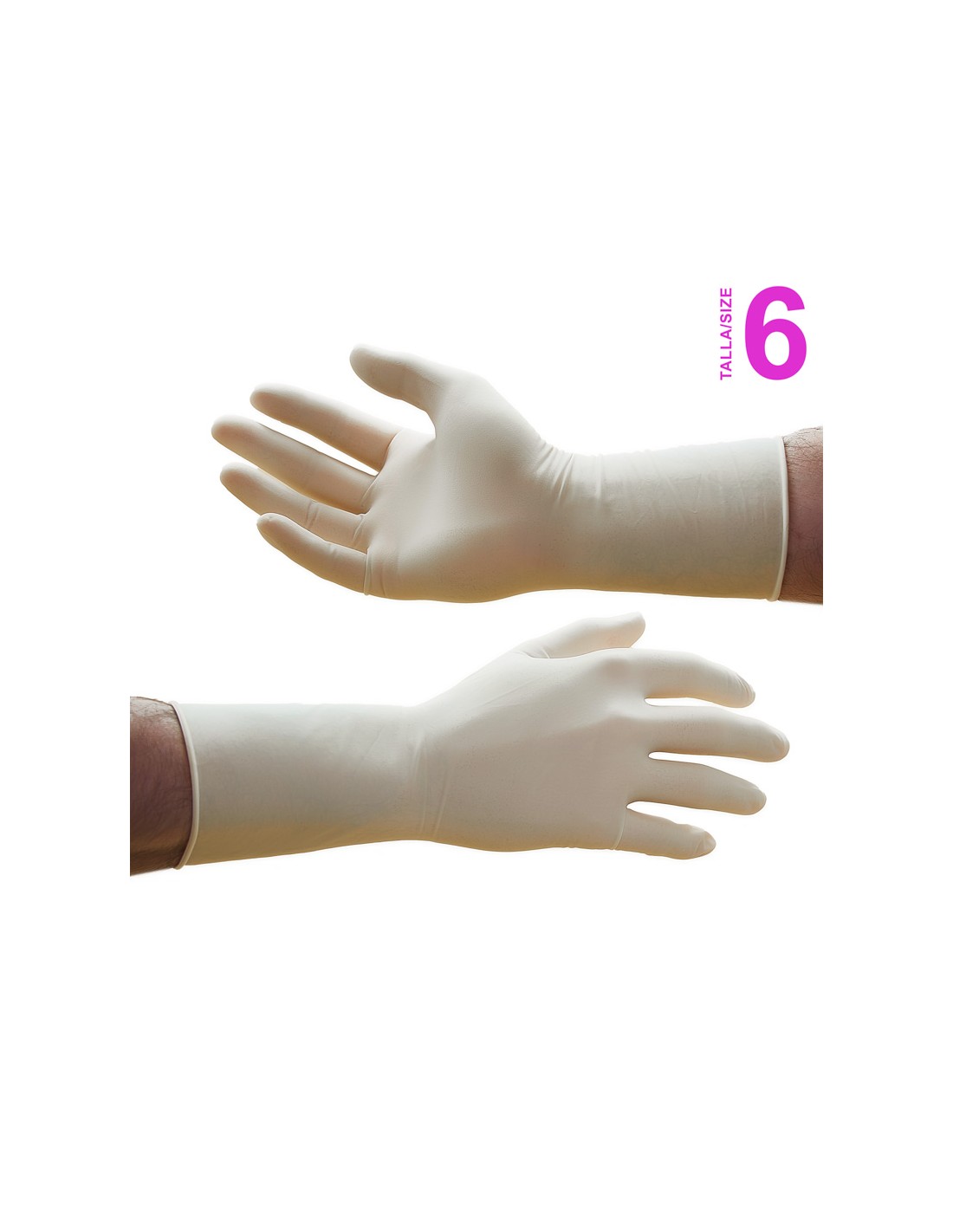 Latex surgical gloves, single use. Sterile and powder free. Microtexture surface. Anatomical shape and high touch sensitivity. Available in several sizes. Size 6. Box with 50 pairs.